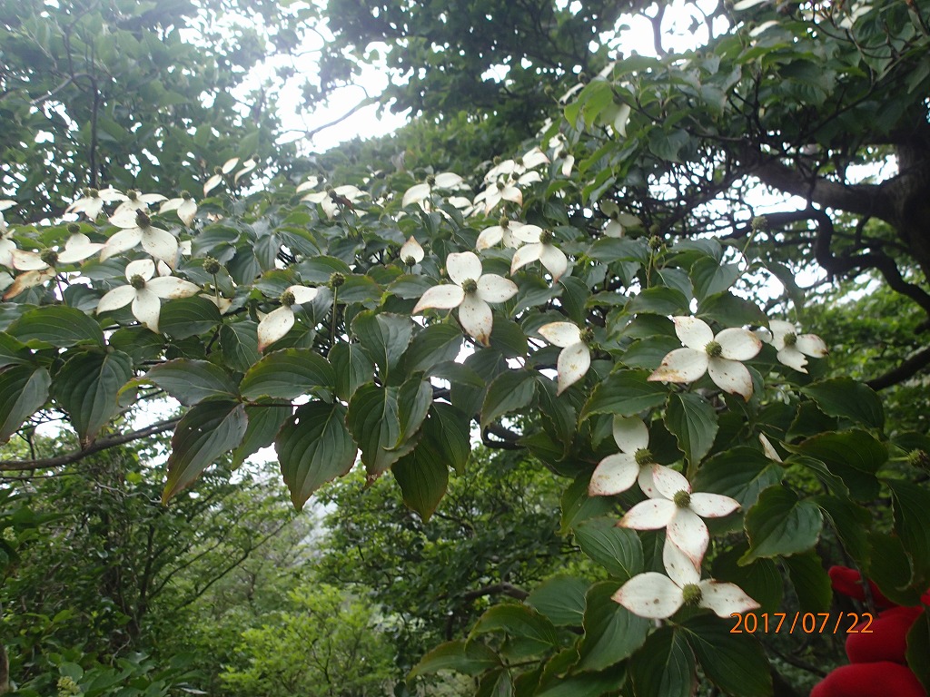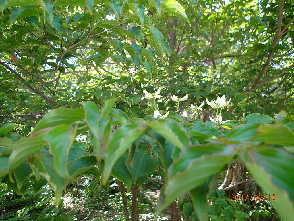 鳥居のすぐ手前にもヤマボウシの木ある。