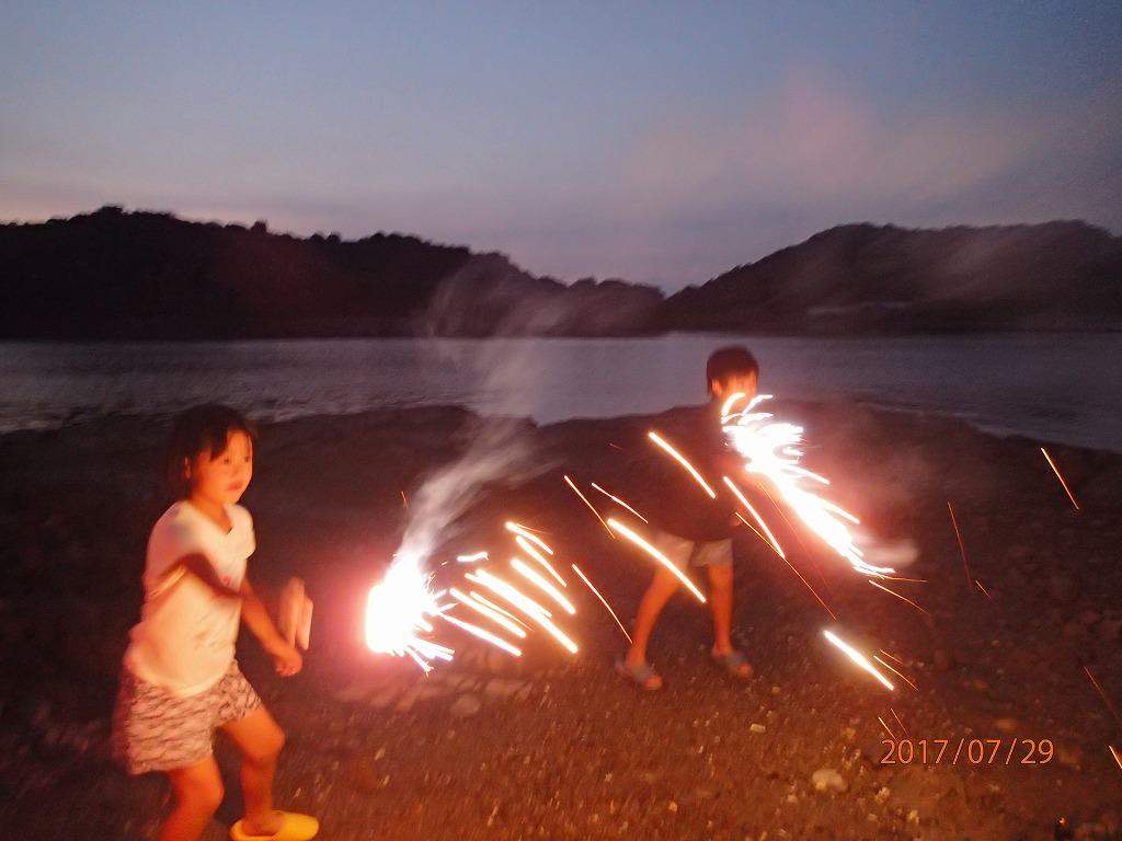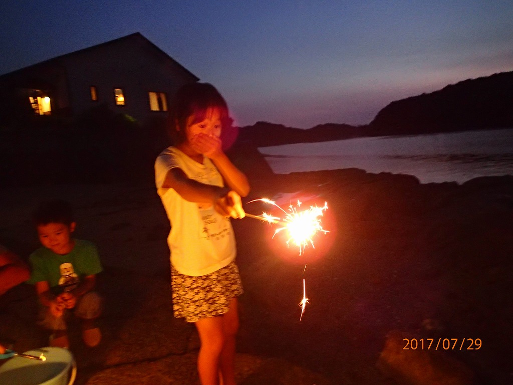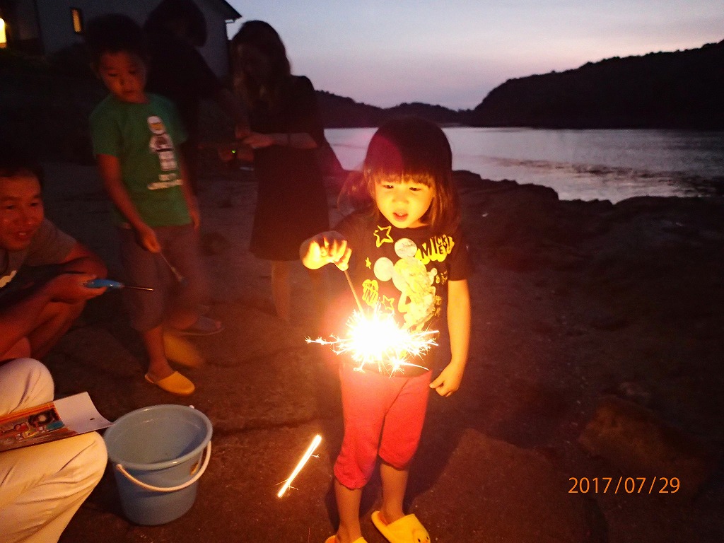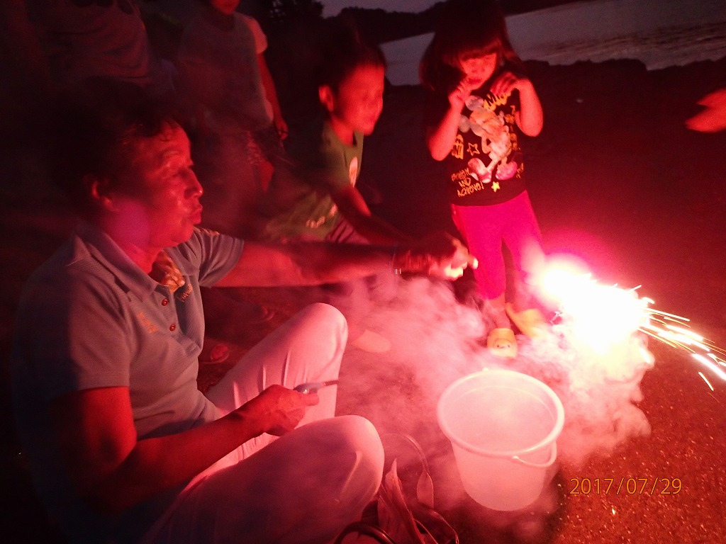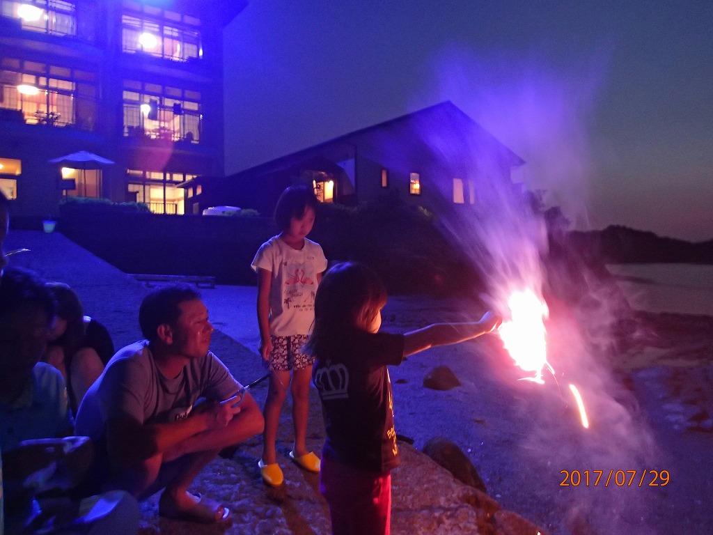 夕食後に、ホテルの裏の渚で花火をして遊んだ。ホテルがくれた花火と宗寛が持ったきた花火があったので充分楽しめた。また、海の向こうの花火大会が見えてこれも美しかった。