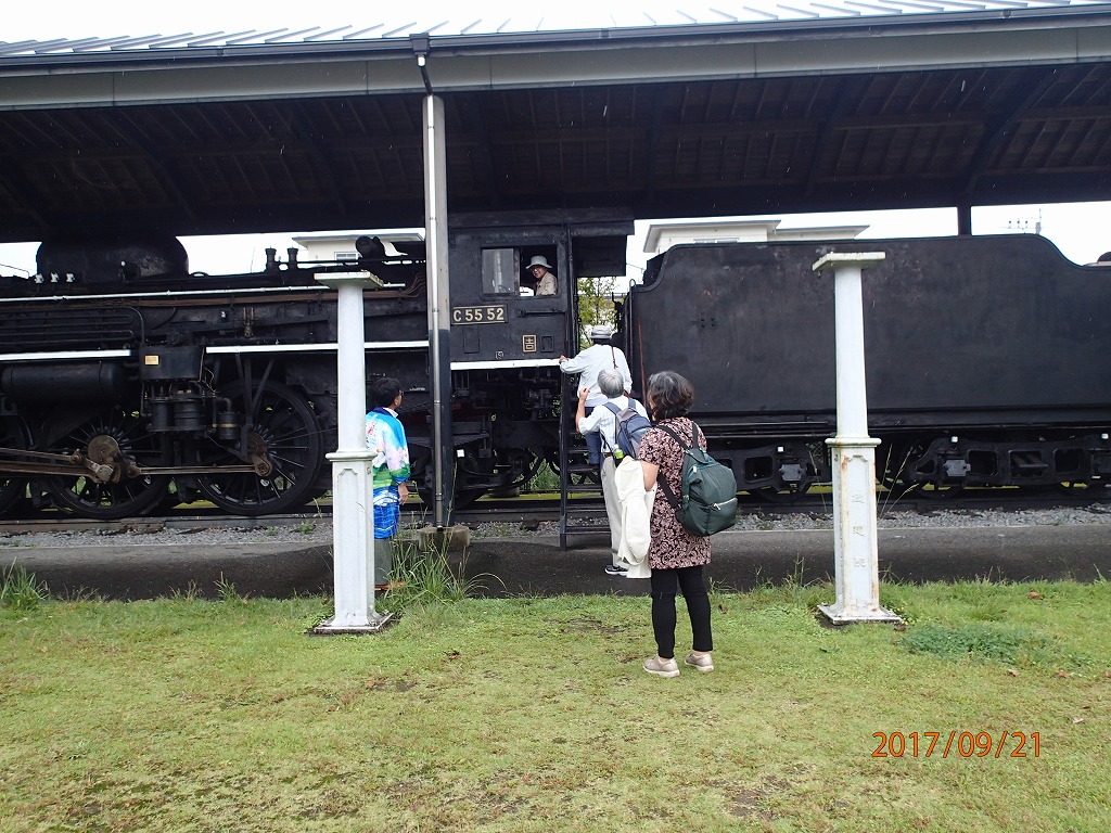 稲田さん、蒸気機関車に乗り汽笛を鳴らす。