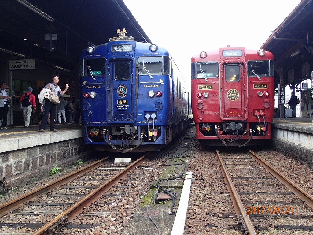 中央駅に集合(9時)、「はやとの風2号」(9時26分発)にて11時11分に吉松着。ここで、「しんぺい号」(11時49分発)に乗り換え、13時5分に人吉に着く。