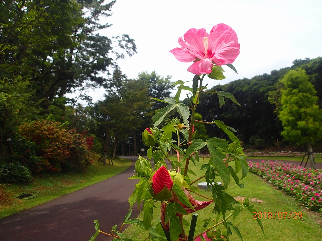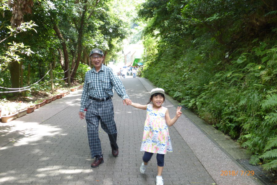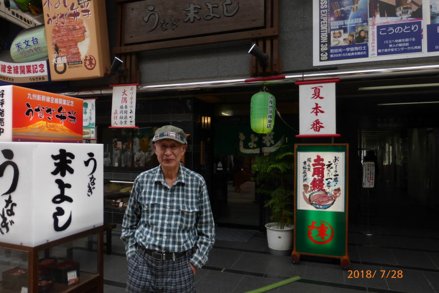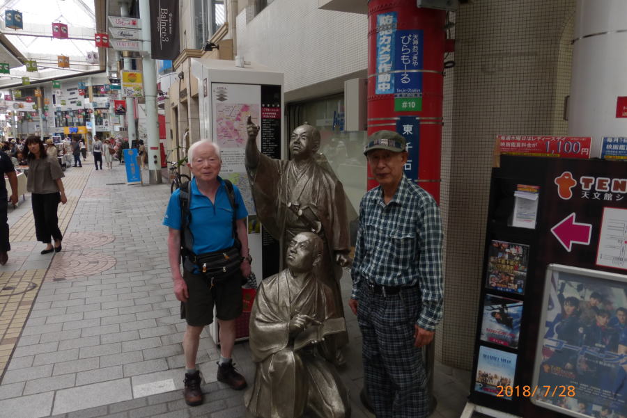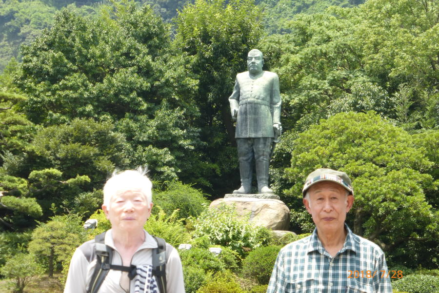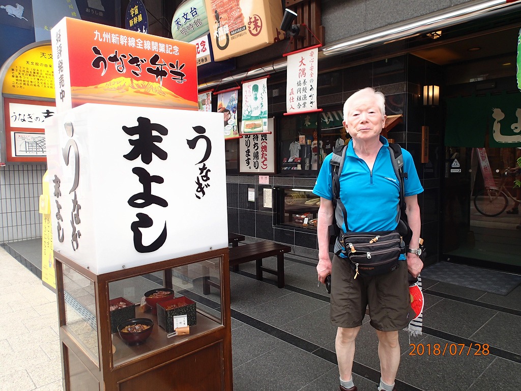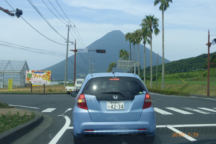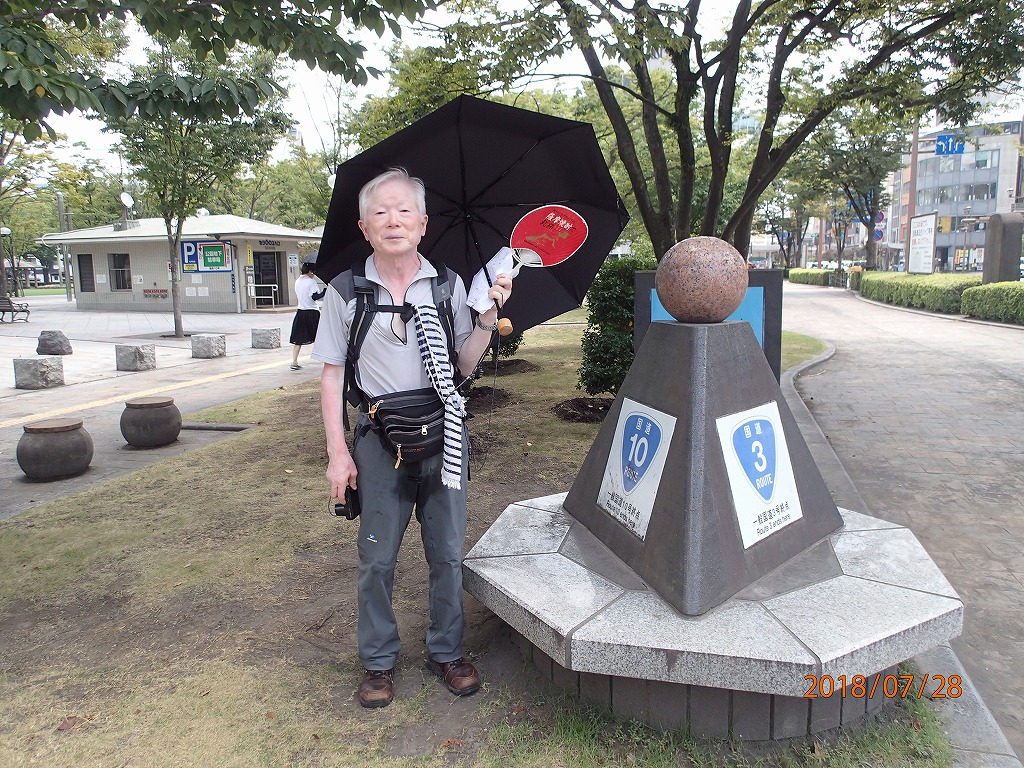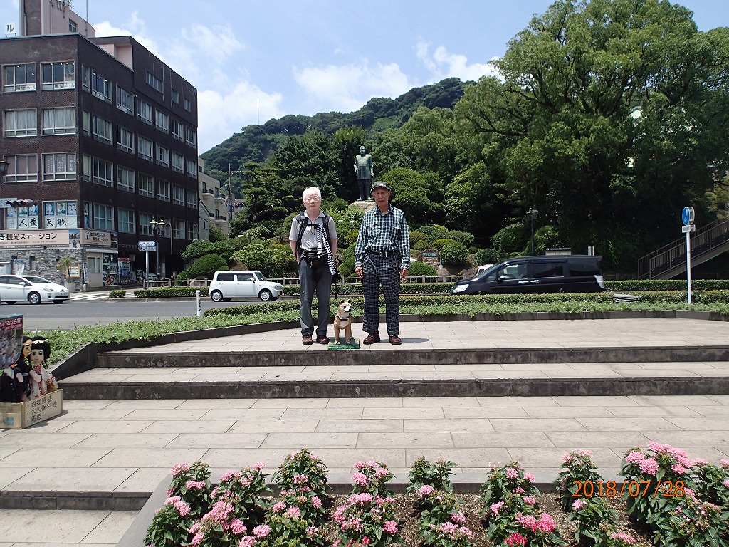 大学時代の学友である多田君は芭蕉の「奥の細道」を始めとして全国の街道を歩いて旅をしている。この度は、「薩摩街道」を踏破する旅で、福岡から数日間かけて歩いて来た。今日は殺人的な暑さのなか伊集院から約20Kmを5時間ほど歩いて街道の終点である鹿児島中央公園で落ち合う。今年は異常気象で各地は記録的な暑さである。このような天気のなか「日よけの傘」を差しながら歩いてきた。周りの人に説明したらあきれていた。とりあえず彼は公園のトイレで着替えた。
