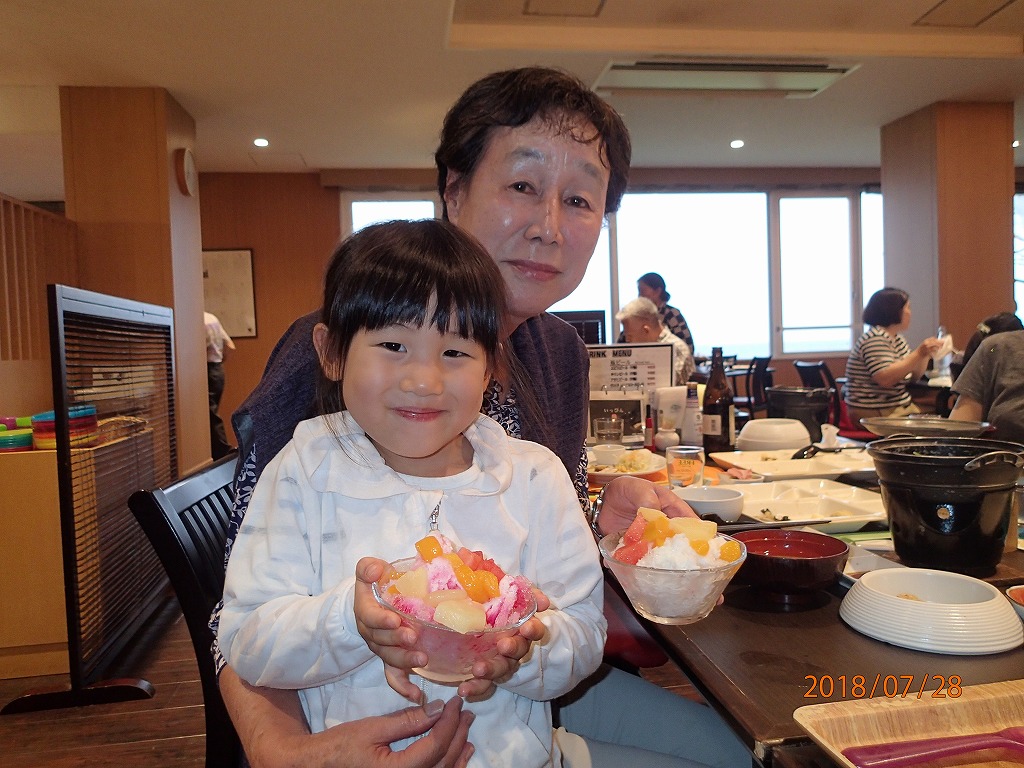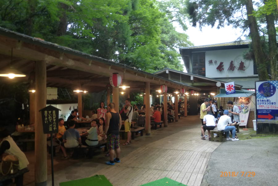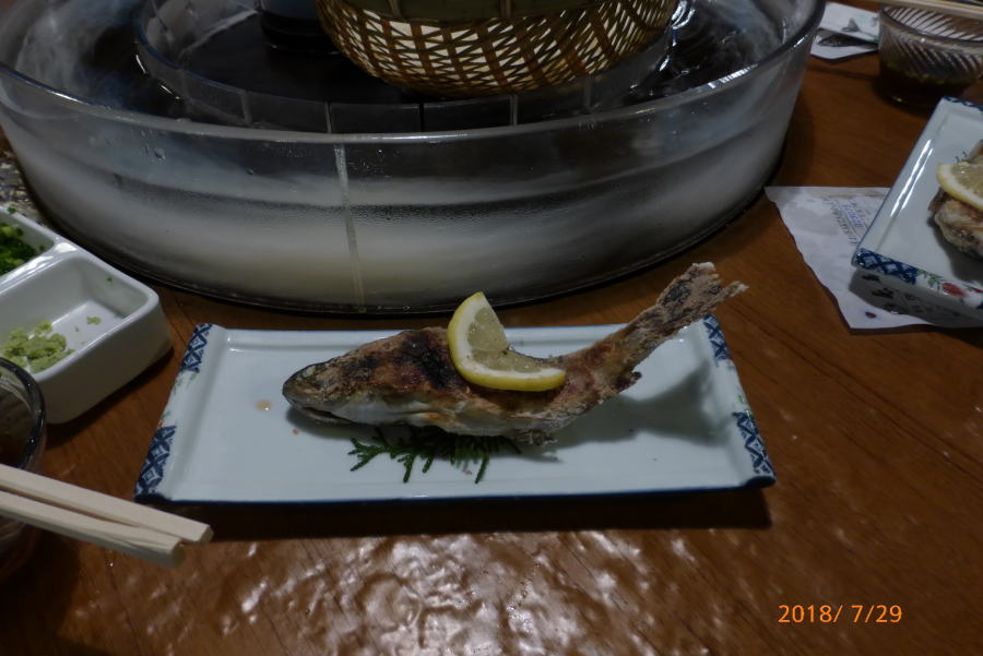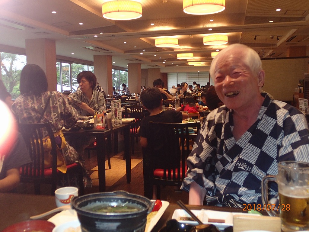 砂蒸し温泉に入り、露天風呂で汗を流してから、夕食をとる。多田君は炎天の中を歩いてきたので、生ビールを2杯もグイグイと飲んでいた。美味そうだ!!