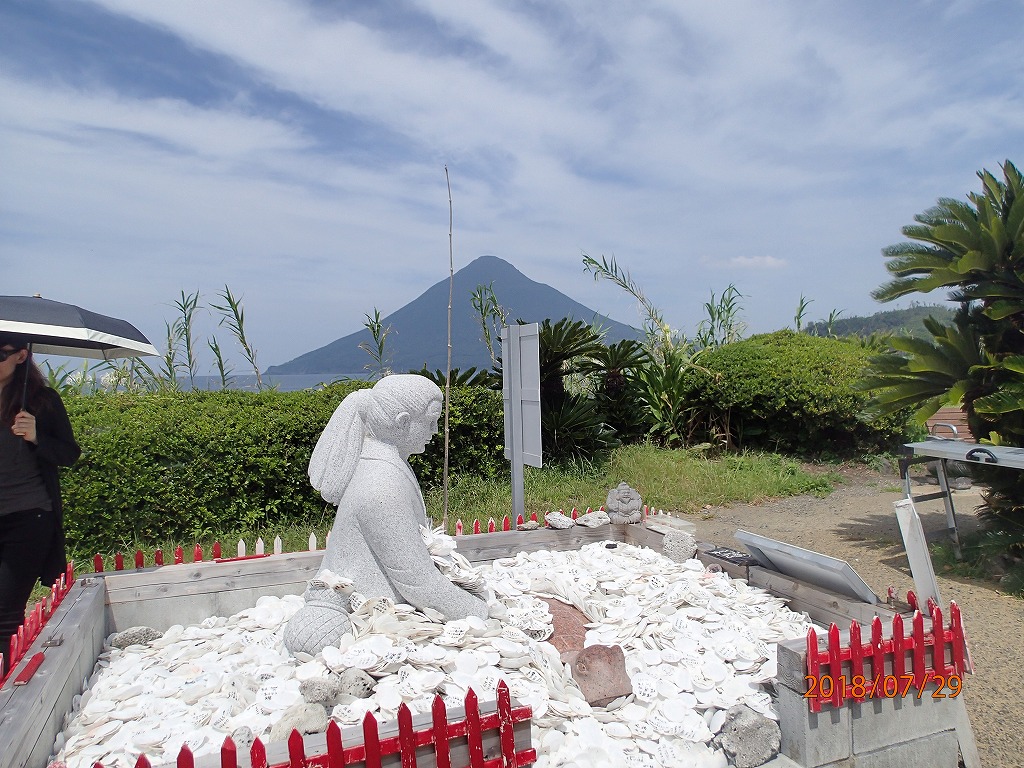 浦島太郎の後ろに薩摩富士(開聞岳)が見える。