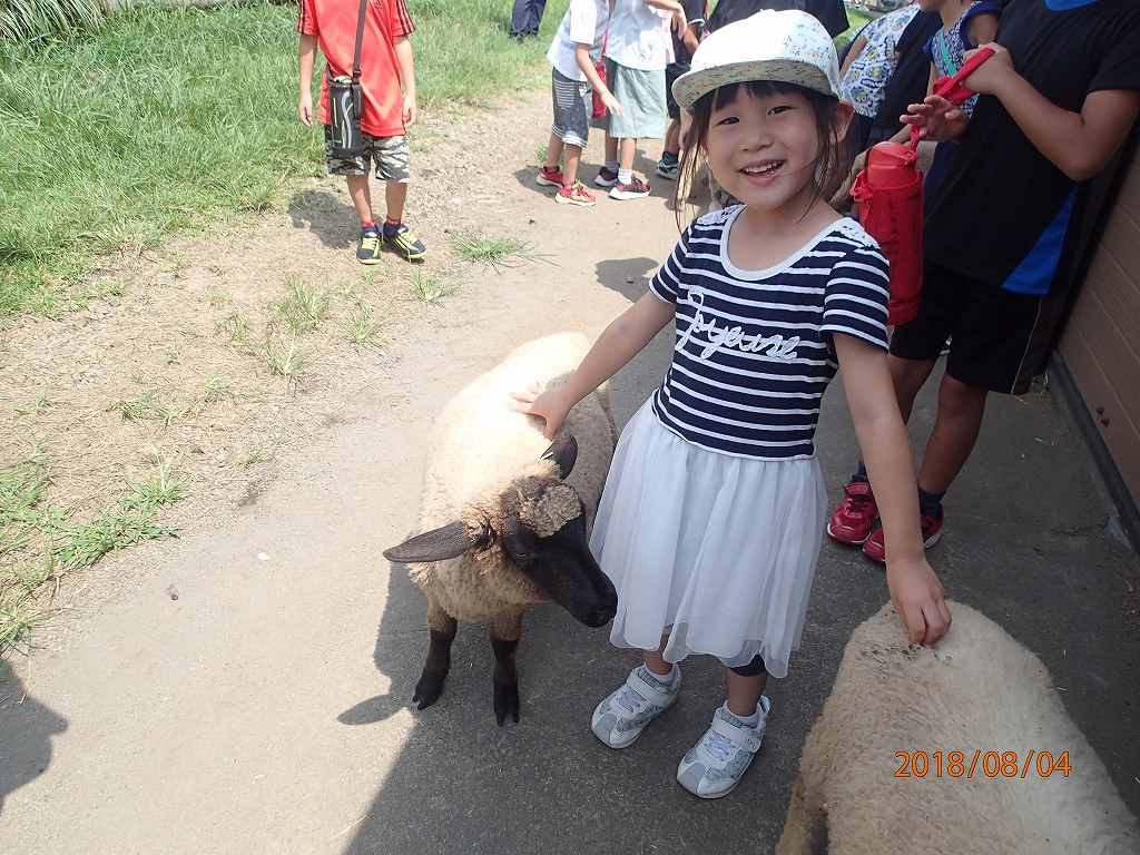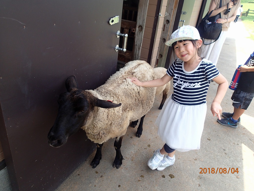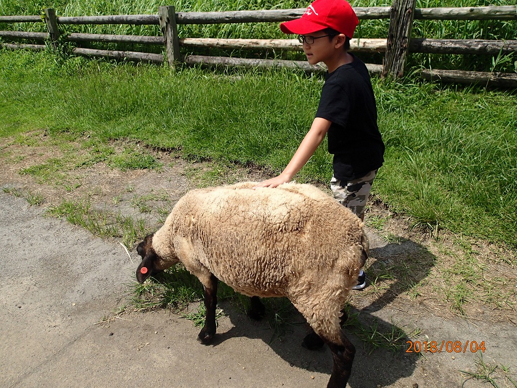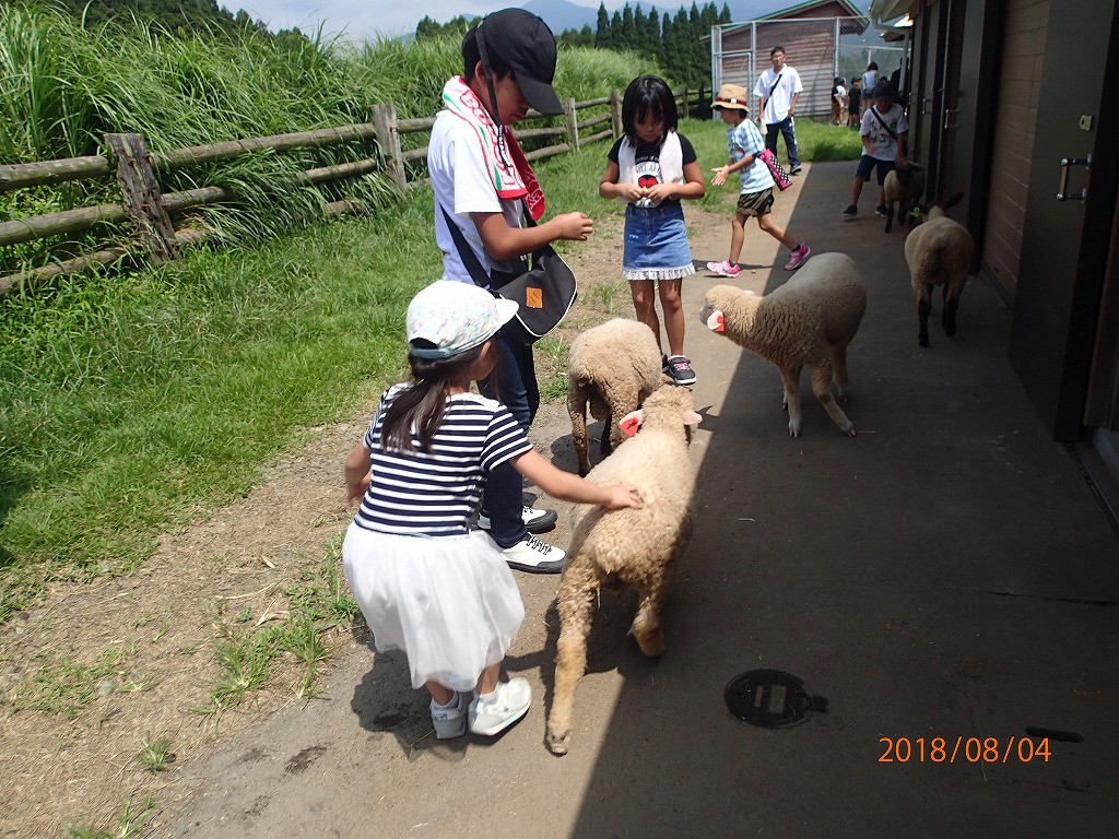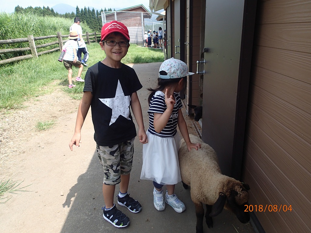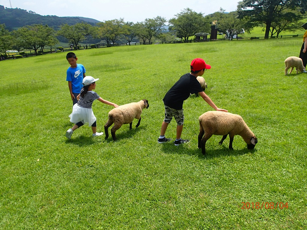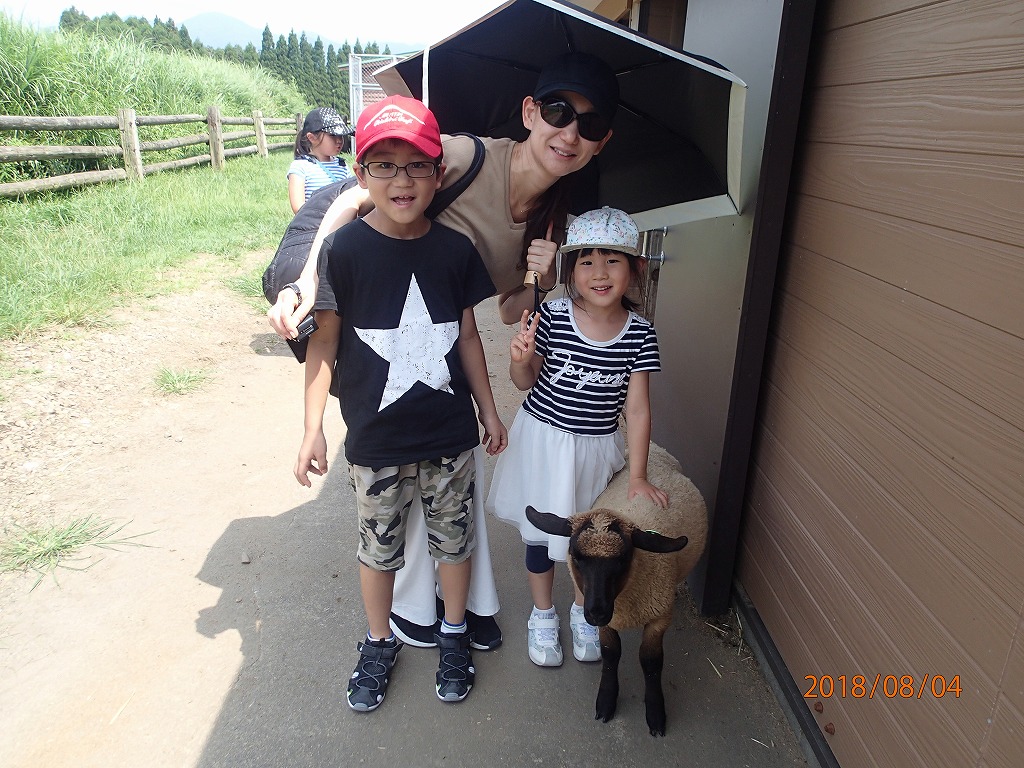 宗寛家族に会う前に、高千穂牧場に行き、ヒツジと触れ合って遊ぶ。