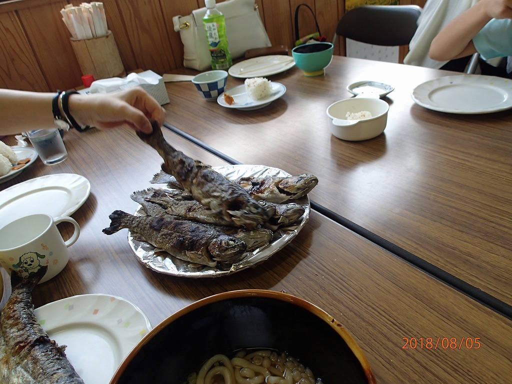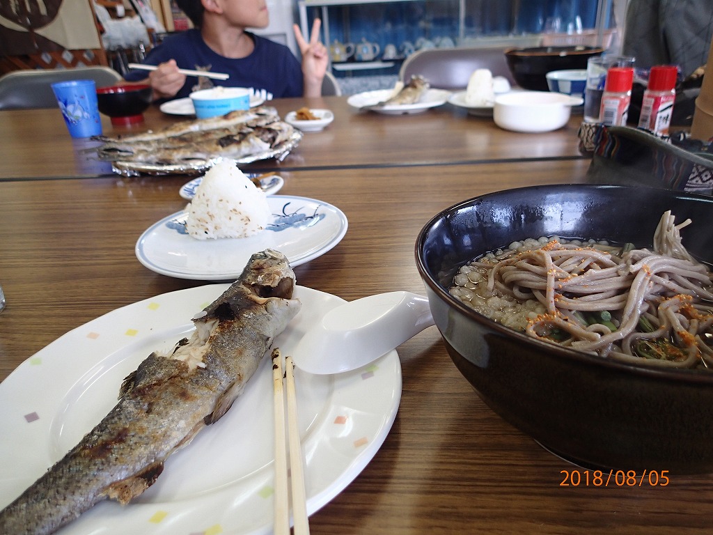 さばいた魚を近くの食堂で焼いてくれる。これをおかずにして、おにぎり、蕎麦、うどんを注文して食べた。残った焼魚はもって帰る。