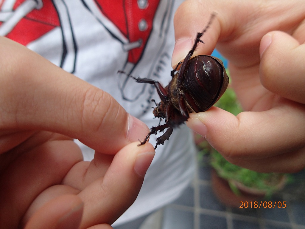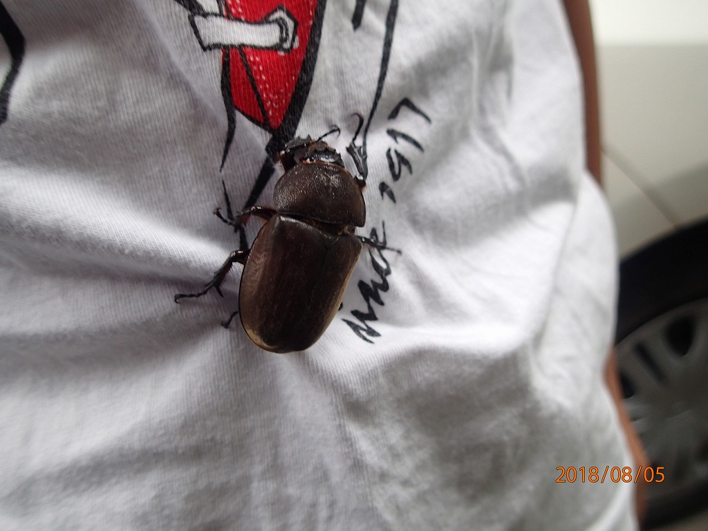 家に着いたら玄関にカブトムシがいた。ケンちゃんの服にくっついた。