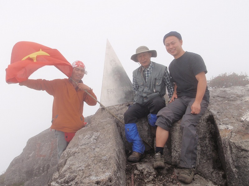 アプローチはハノイから寝台列車で約8時間半でラオカイに着き、ここからバスで少数民族の住むサパに行きホテル泊。サパから車で登山口のチャムトン峠(約2000m)に行き登山を開始。ブナや竹林のなかを登り第一ベース・キャンプ(約2400m)で昼食をとり、第二ベース・キャンプ(約 2800m)でテント泊。登山の2日目はこのベース・キャンプからファンシーパンに登頂して第一ベース・キャンプまで戻りそこでテント泊。登山の最後の日はこの第一ベース・キャンプから登山口に戻りました。最初のテント泊のときはテントが飛ばされるほどの強風が吹き雨も降りましたが、朝になると雨もやみ無事に全員が登頂できました。ただ、今は雨季の直前で山頂は雲の上で下界が見えず残念。キャンプでは参加者の一人が篠笛を吹き、外国人登山者とポーターそれに我々による歌合戦で盛り上がりました。