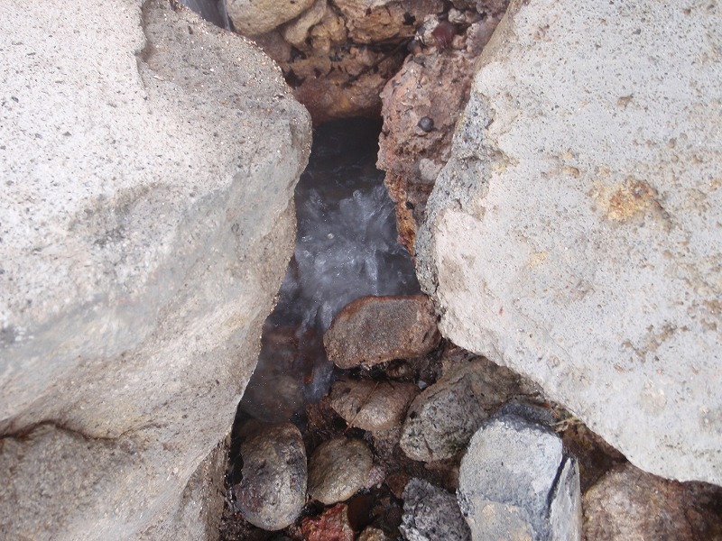 2日目の前岳-黒岳縦走は「シャクナゲ観賞登山」に相応しく登るにつれて、淡い赤から少し濃い赤それに白など個性のあるシャクナゲの花を満喫できました。海抜高度によって盛りの時期が異なるのですね。帰り道にある風穴に入ってみたら底は霜が降りたように白くて確かに涼しい。