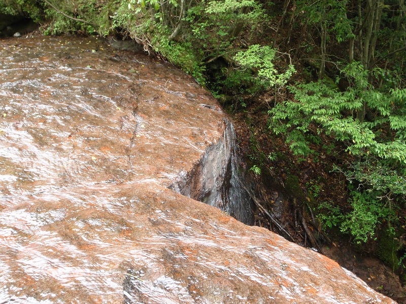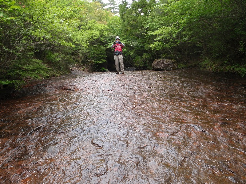 初夏ということで、やはり水はまだ冷たく、また温泉の上部の遡行なので温泉の恩恵はありません。それでも水に浸かれました。沢を縁取る新緑は美しく、白い水と赤い滑床に映えています。